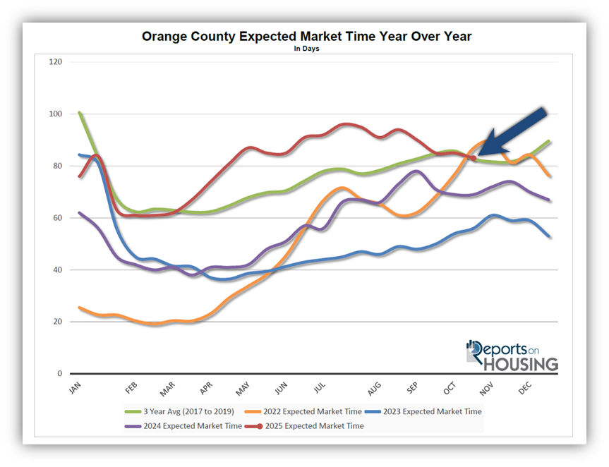 - MARKET TIME: With the inventory falling at a faster pace than demand, the Expected Market Time, the number of days to sell all Orange County listings at the current buying pace, decreased from 86 to 83 days in the past couple of weeks, its fastest pace since April. It is the highest October level since 2022. Last year, it was 69 days, faster than today. The 3-year average before COVID (2017-2019) was 85 days, similar to today.