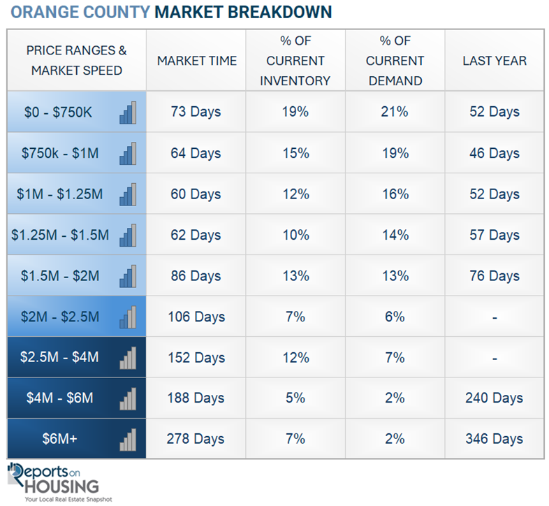 - DISTRESSED HOMES: Short sales and foreclosures combined, comprised only 0.2% of all listings and 0.2% of demand. Only four foreclosures and four short sales are available today in Orange County, with a total of eight distressed homes on the active market, up one from two weeks ago. Last year, five distressed homes were on the market, similar to today.