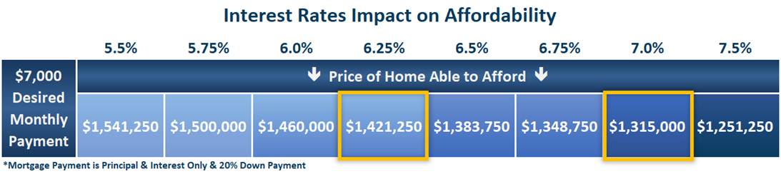 As rates drop, affordability improves. Many buyers have been waiting on the sidelines for a more favorable environment. For buyers looking for a $7,000 monthly payment with 20% down, at 7%, they were looking at a $1,315,000 home. At today’s 6.25% rate, they can now afford a home at $1,412,250, which translates into an additional $97,250 in purchasing power.