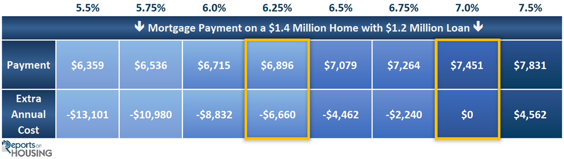 Another way to look at the improvement in affordability is to compare the payment on a specific-priced home as rates drop. For a $1.4 million home with 20% down, the payment is $7,451 at 7%. The payment drops to $6,896 per month at today’s 6.25% rate, a $555 savings per month, or $6,660 per year.