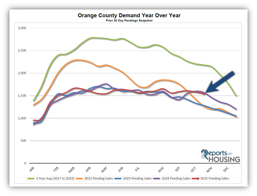 Demand, a snapshot of the number of new pending sales over the prior month, decreased from 1,582 to 1,546 in the past couple of weeks, representing a 36-pending-sale drop, or 2%. Last year at this time, mortgage rates had just eclipsed 7% for the first time since July, and they remained elevated until the end of February with only a few exceptions. Today’s more favorable mortgage rate environment will translate to elevated demand to close out the year and will instigate stronger demand into 2026. Typically, demand drops at a pace similar to that of inventory, but it is currently falling much more slowly. This is resulting in the housing market improving from week to week.