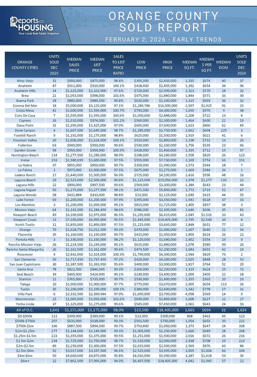 - CLOSED SALES: There were 1,641 closed residential resales in December, nearly identical to December 2024’s 1,634 sales, and up 10% from November 2025. The sales-to-list price ratio in Orange County was 98.0%. Foreclosures accounted for 0.1% of all closed sales, and short sales accounted for 0.1%. That means that 99.8% of all sales were sellers with equity.