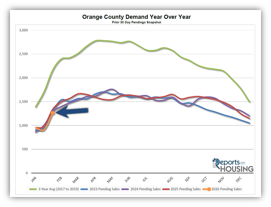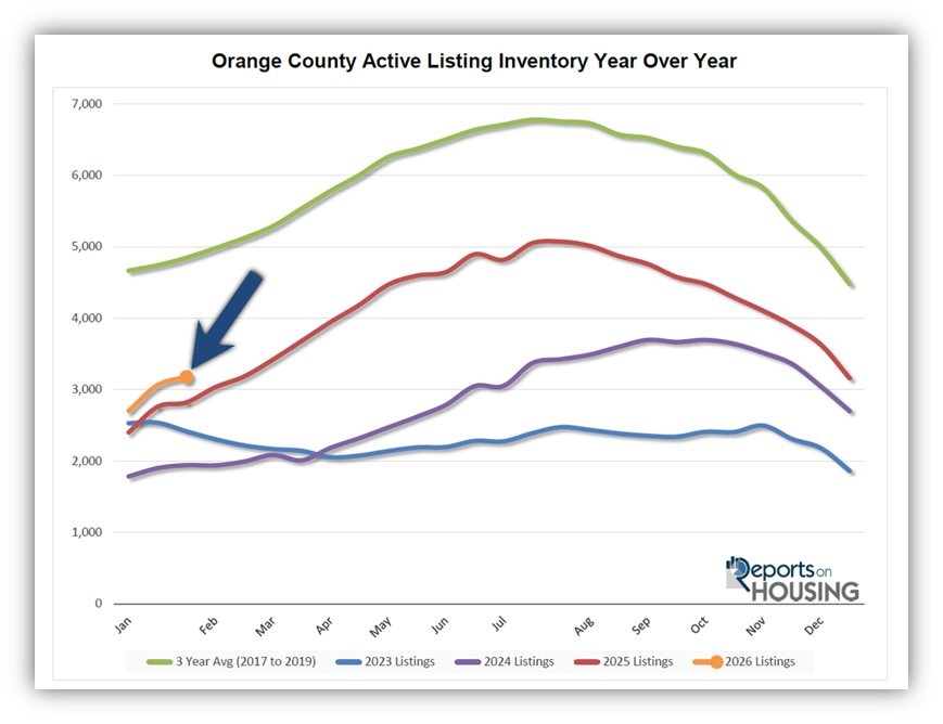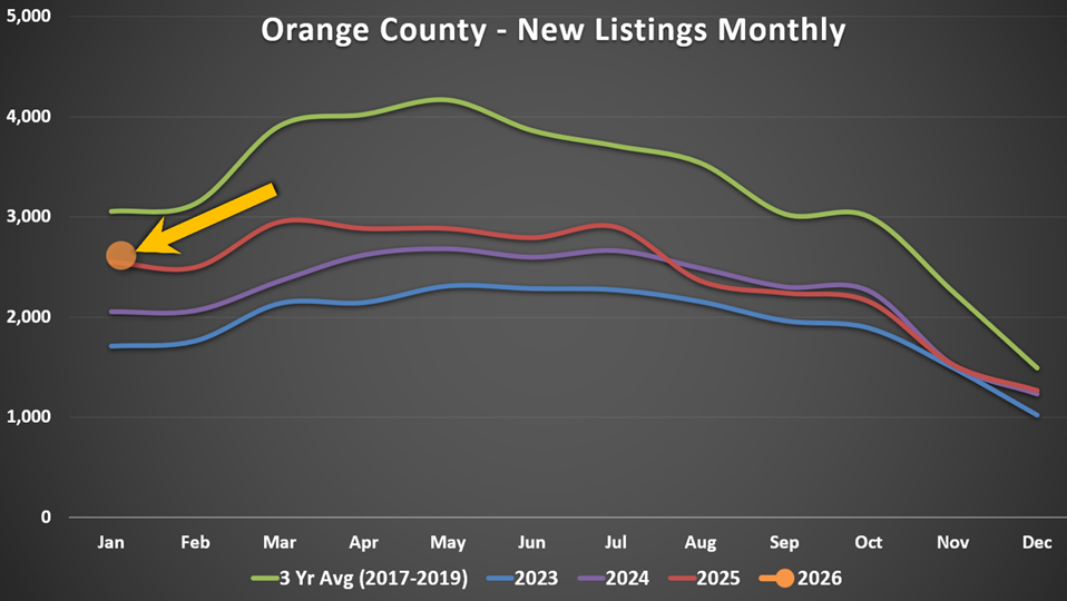 Homeowners continue to “hunker down” in their homes, unwilling to move because of their current, underlying, locked-in, low fixed-rate mortgage. This trend has been easing from the lows established in 2023. In January, 2,588 homes were placed on the market in Orange County, 466 fewer than the 3-year average before COVID (2017-2019), 15% less. In 2025, 2,545 homes entered the market, compared to 2,054 in 2024, and 1,710 in 2023. A similar number of homes are coming on the market this year compared to last.
